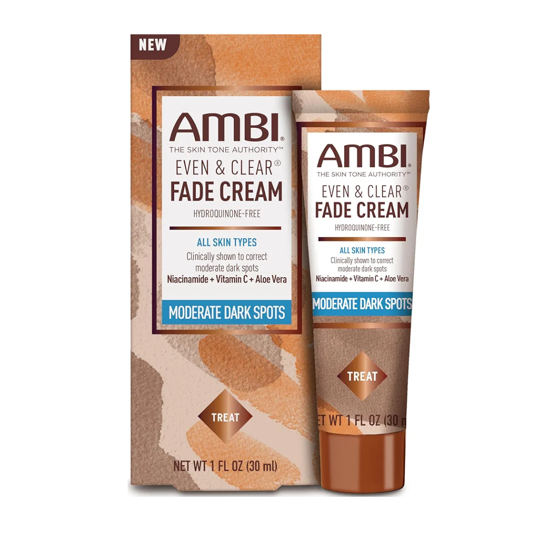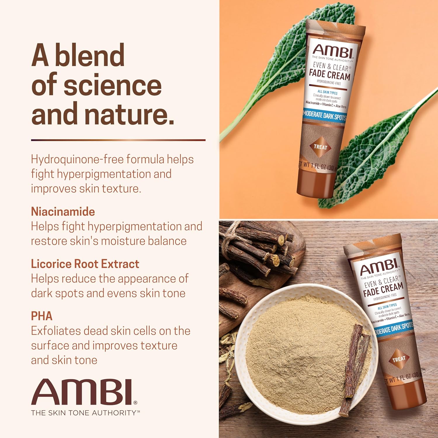 AMBI® EVEN & CLEAR FADE CREAM HYDROQUINONE-FREE, is a clinically studied treatment that gradually fades and corrects dark spots and discolorations, including those caused by acne, improves uneven skin tone and deeply hydrates skin for a radiant and smooth appearance. This formula safely and effectively delivers results in as little as 4 weeks and improves skin tone with continued use.