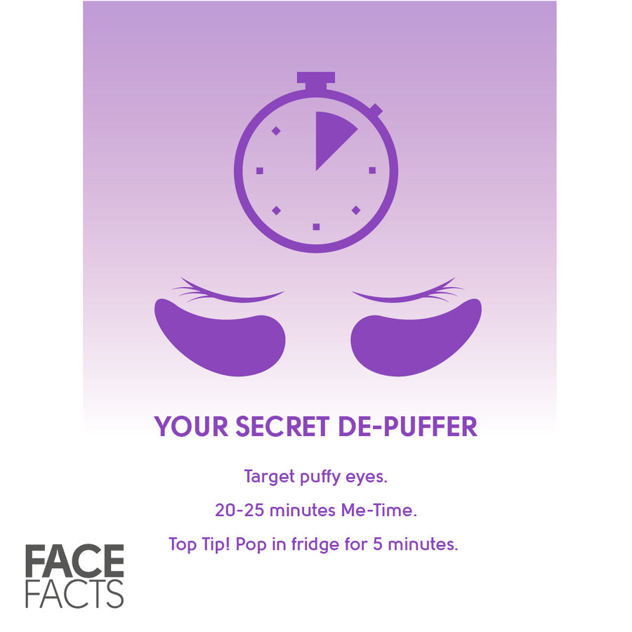 Face facts under-eye gel patches are infused with a cocktail of skin hero's like Glycerin & Red Seaweed to lock in that much needed hydration for that instant plumping effect. Whilst the Collagen & Lavender extracts help reduce the appearance of fine lines and tighten the skin below the eyes.