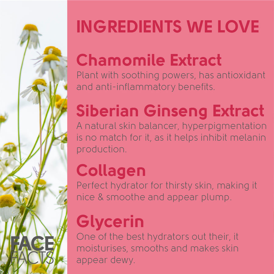 Face facts under-eye gel patches are infused with a cocktail of moisturising hero's like Collagen, Glycerin & Red Seaweed. Then these lovely botanicals, Chamomile & Ginseng which are known to help soothe the skin, reduce puffiness and reduce the appearance of dark circles below the eyes.