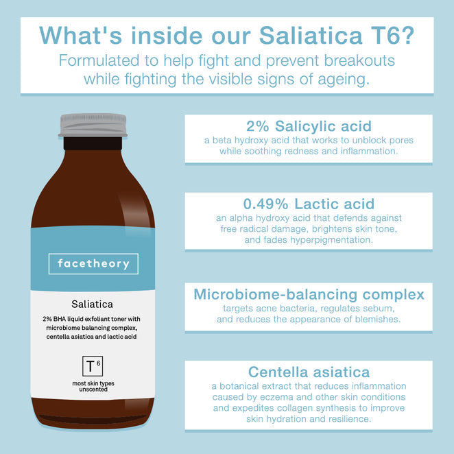 Formulated especially for oily, combination, congested and acne-prone skin types, our Saliatica 2% BHA Toner T6 works to promote a clear and flawless complexion.