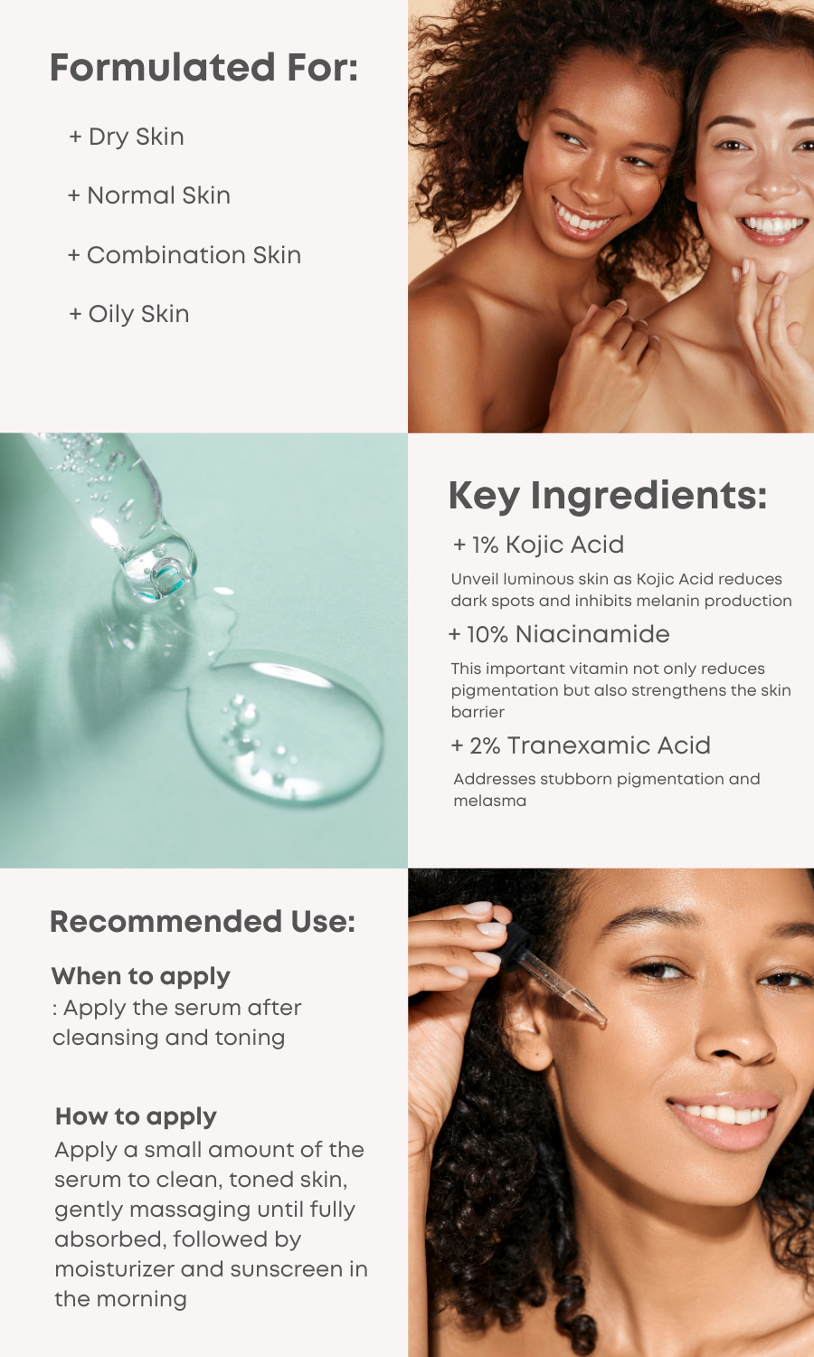 Achieve radiant skin with this Brightening Serum, containing 1% Kojic Acid, 10% Niacinamide, and 2% Tranexamic Acid to target dark spots and even skin tone.