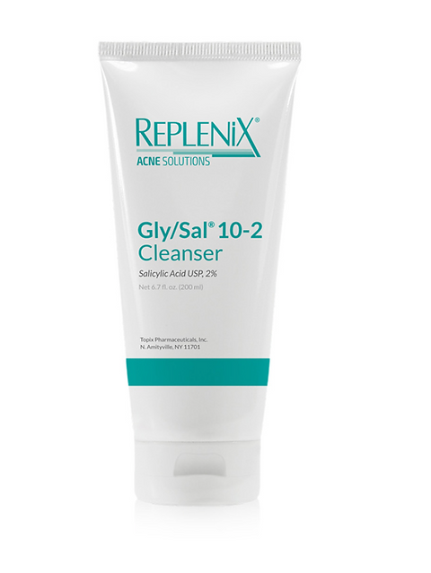 REPLENIX Acne Solutions Gly/Sal 10-2 Cleanser contains two exfoliating ingredients to renew the skin. The 10% glycolic acid in this cleanser removes oil and dead cells from deep within pores to help regulate oil production and encourage skin healing. Two percent of salicylic acid eliminates bacteria on the skin surface and helps unclog pores. Green tea extract calms and soothes skin to reduce redness and inflammation caused by blemishes.